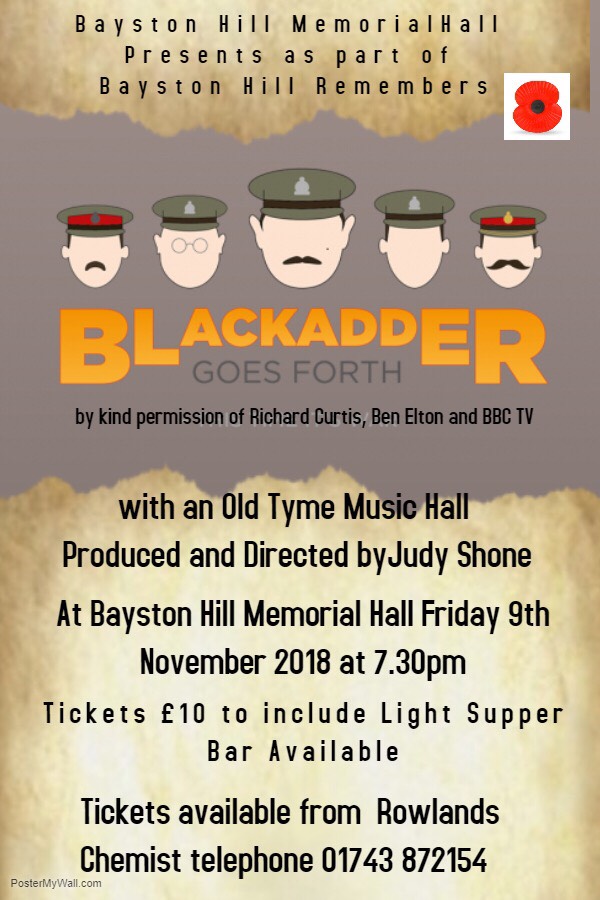 Bayston Hill Remembers.... come along and enjoy a evening of music and drama including a performance of the final two episodes of Blackadder Goes Forth.