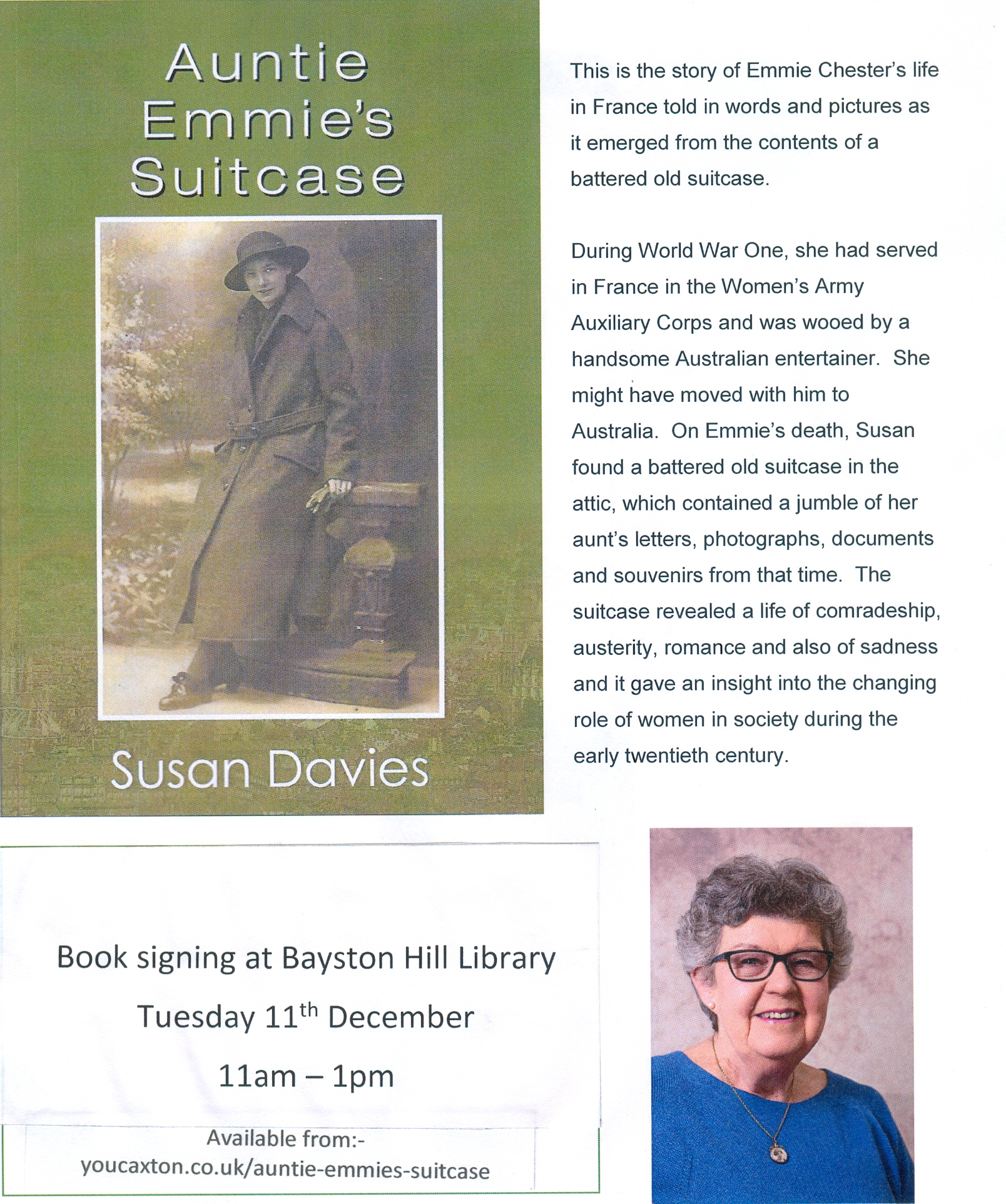 Susan Davies will be signing copies of her book "Aunt Emmie's Suitcase" at Bayston Hill Library between 11.00 a.m. and 1.00 p.m.