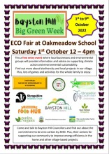 A group of local volunteers along with members of Bayston Hill Parish Council have put together a wide variety of activities for its second Big Green Week. Kicking off with a fantastic Eco Fair at Oak Meadow School, followed by a week full of educational and fun activities for all the family. The week runs from October 1st - 9th.