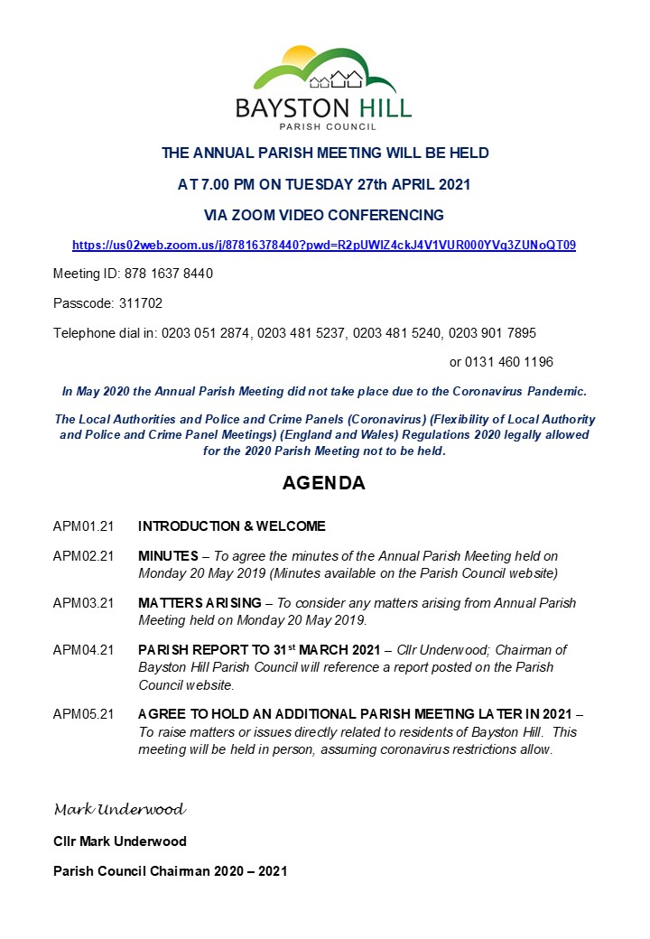 Bayston Hill - Annual Parish Meeting - Tuesday 27th April 2021 - 7pm via Zoom Video Conferencing